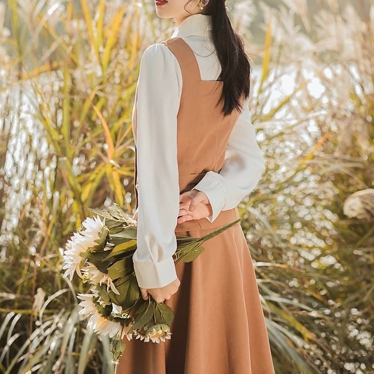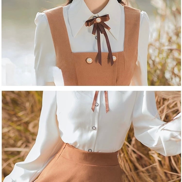 ボウタイリボンのブラウスとベスト、スカートがセットになった、