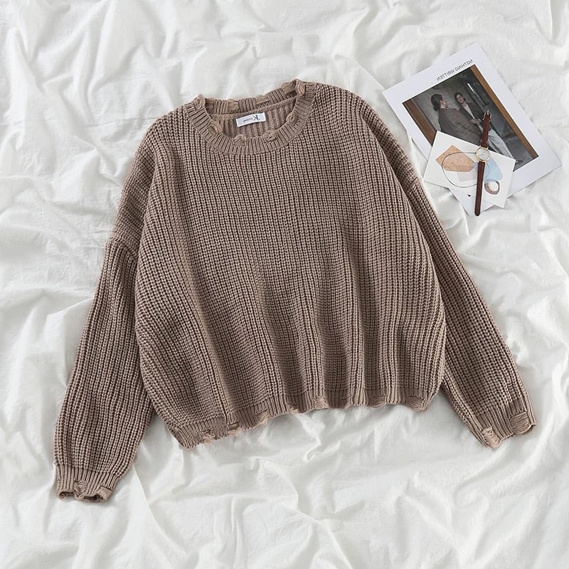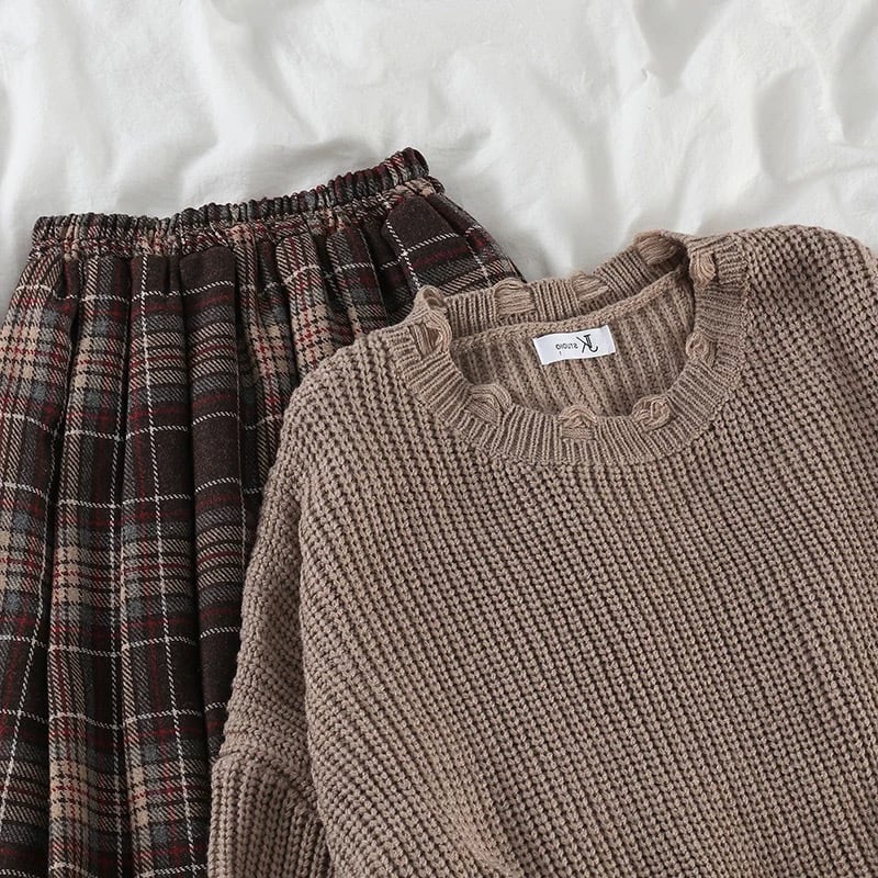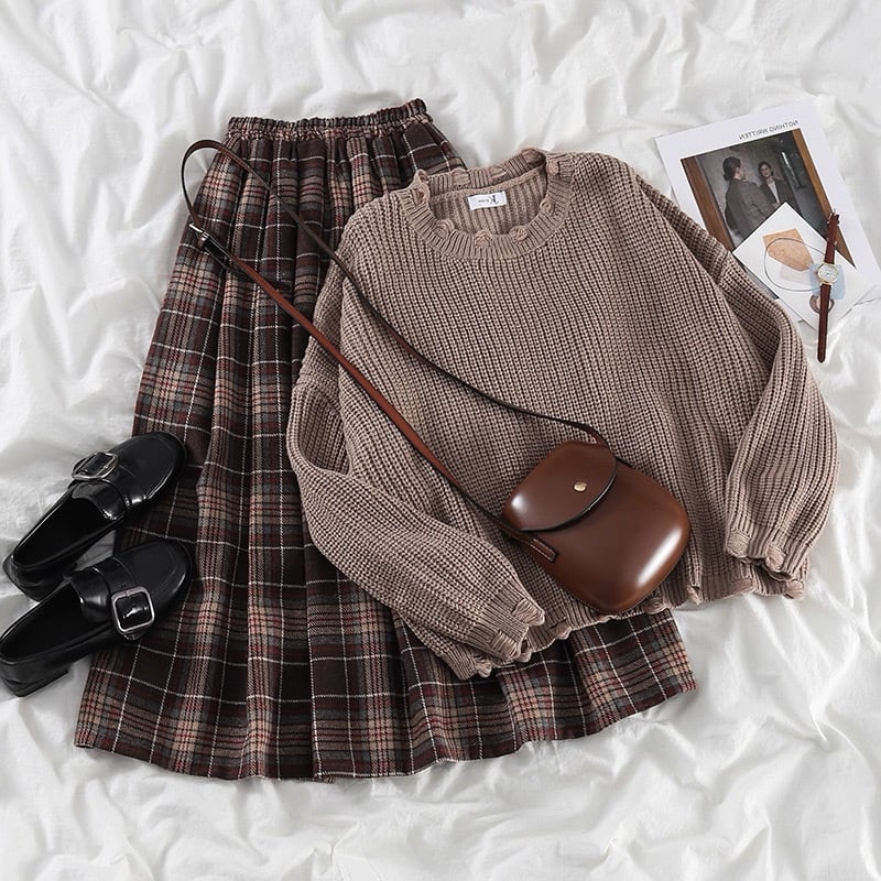 あたたかみのあるブラウンニットと、ほんのりレトロなスカートが秋にぴったり♡