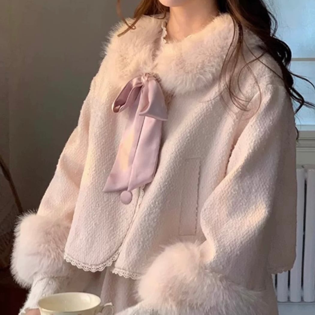 優しいピンクのワンピースと、ファー付きコートのセット♡