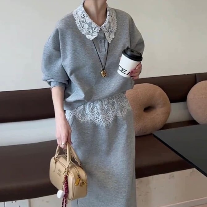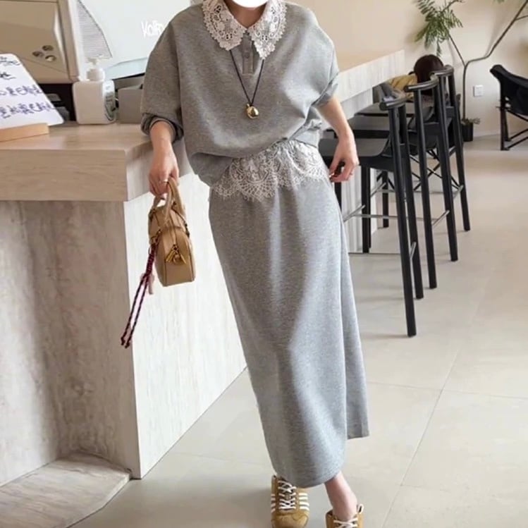 レース襟がアクセントのトップスとロングスカートのセットアップ♡