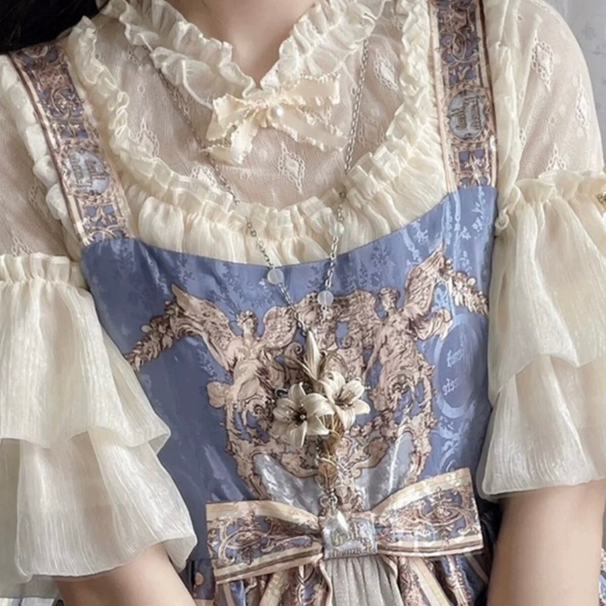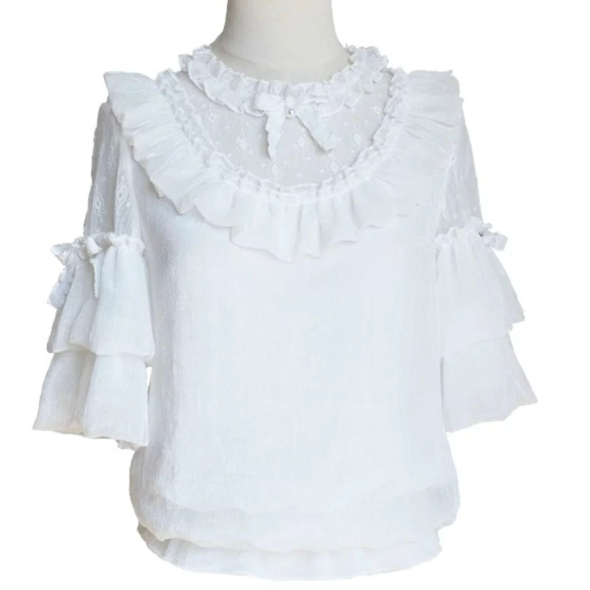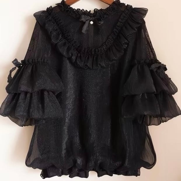ふんわり軽やかなシフォン素材に、フリルとレース襟が映えるブラウス♡