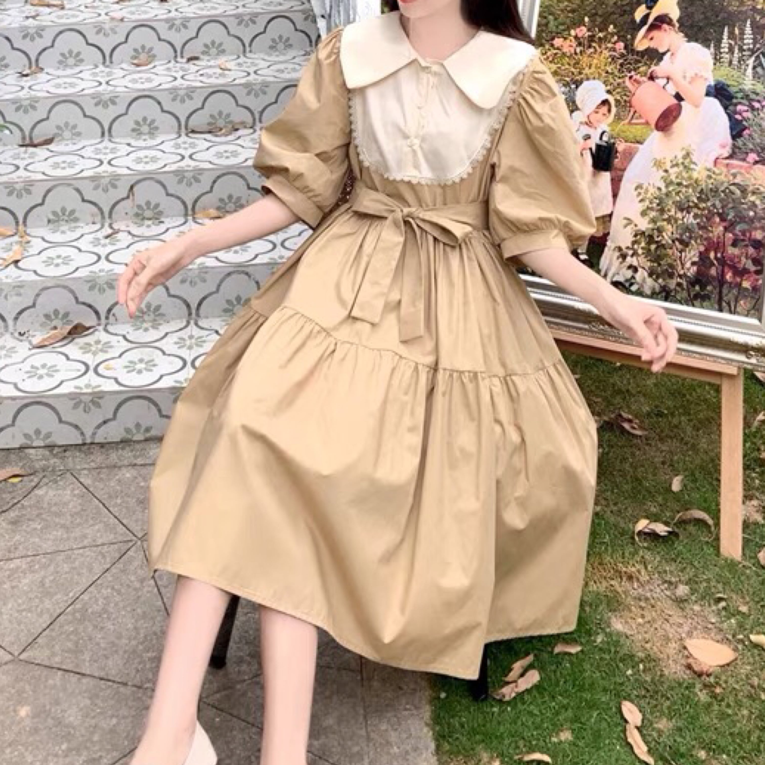 レトロガーリー♡バイカラー襟付きギャザーワンピース B0371
