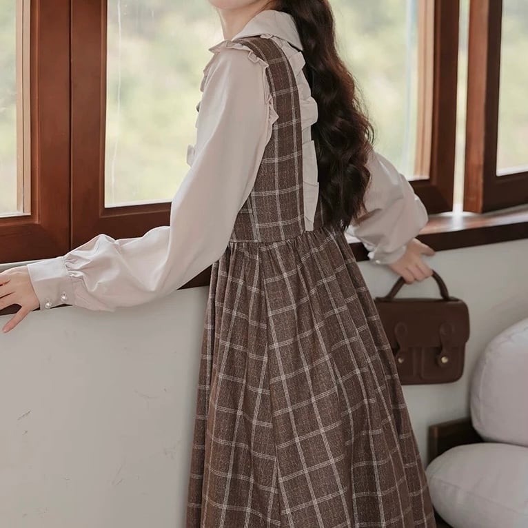 レトロガーリー♡チェック柄フェイクツーピースワンピース E1466